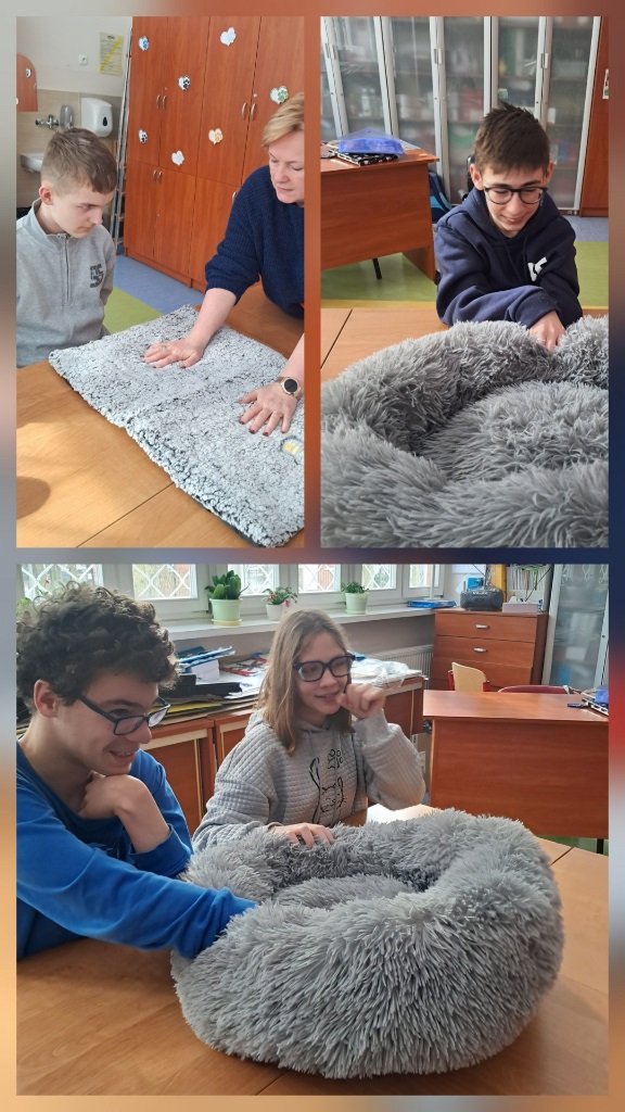 Zobaczyli kocie akcesoria: miękkie legowisko, miski, zabawki oraz książeczkę zdrowia kota.